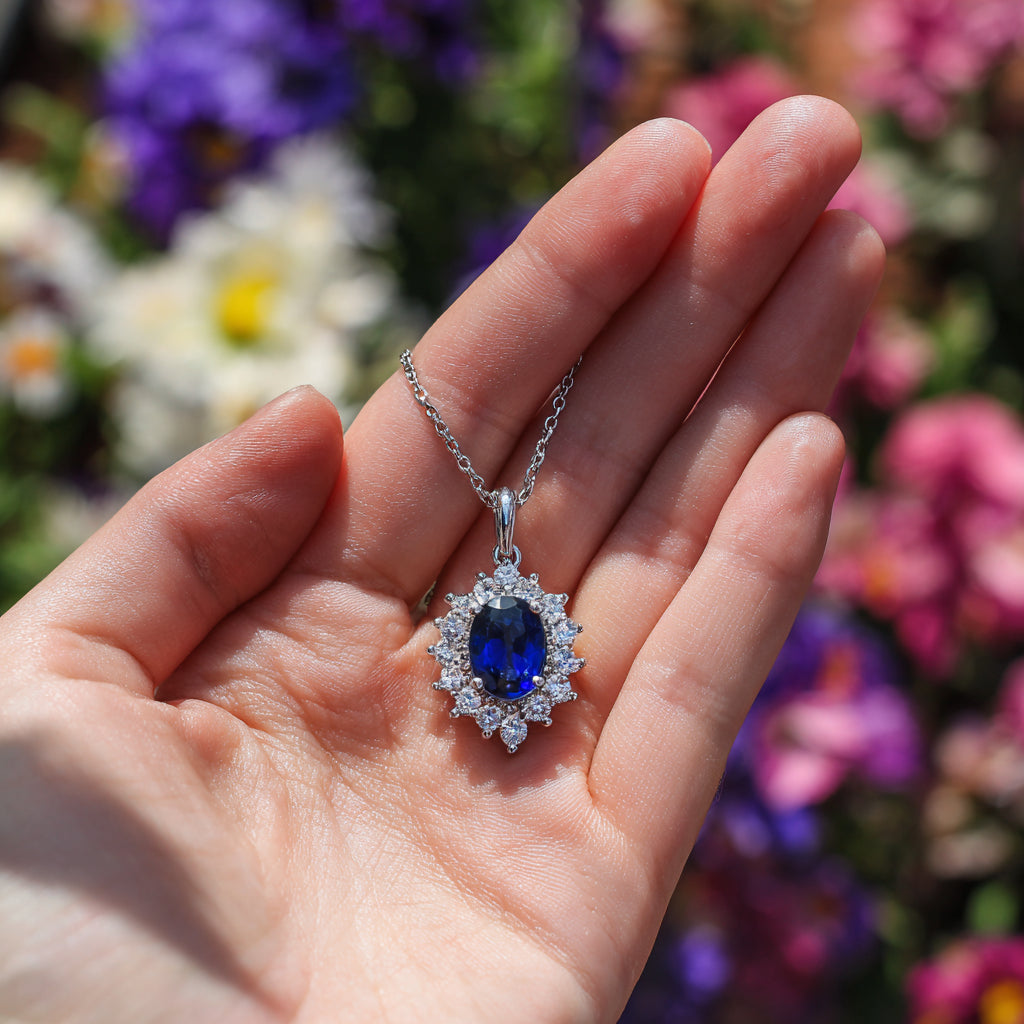 On the Étoile™ Sapphire pendant, a deep blue sapphire is set in the center, surrounded by a shimmering aura of Étoile™ moissanites.