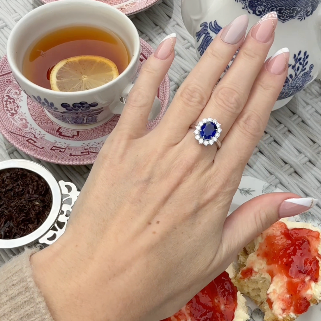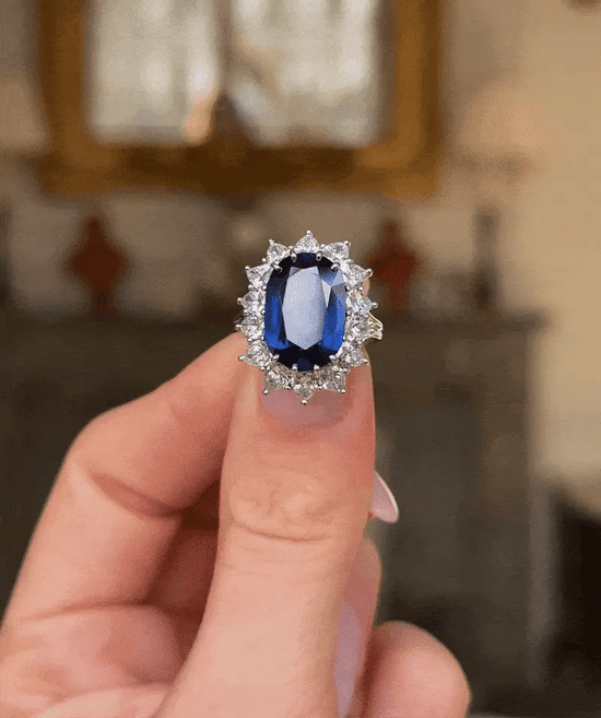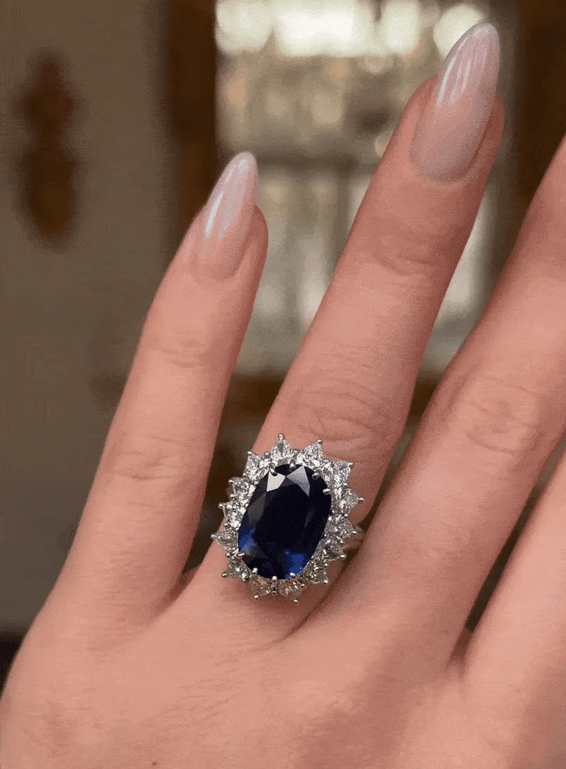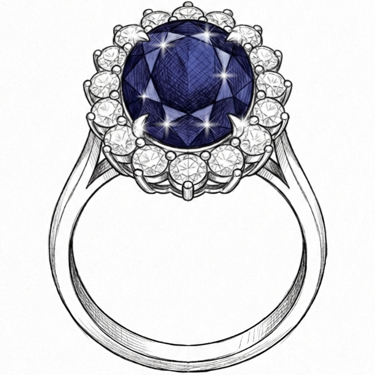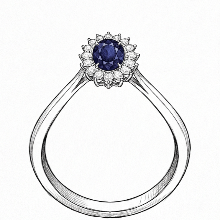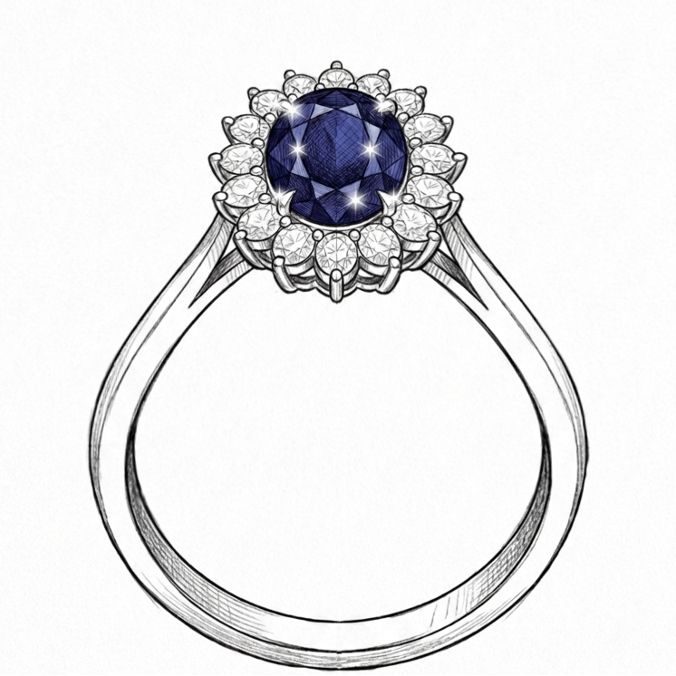 A deep blue sapphire, surrounded by a halo of brilliant moissanites. The same design Princess Diana chose. The same ring Catherine wears today.